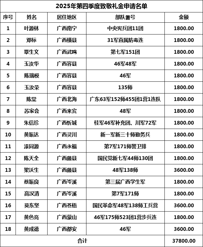 第四季度,广西壹方慈善基金会计划向深圳市龙越慈善基金会申请18名抗战老兵致敬礼金,申请名单及金额如下表所示,在此公示。公示时间为3天,接受社会公众监督。